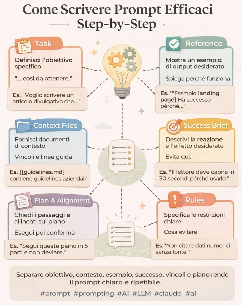 Ci sono quattro leve ricorrenti: tipo di output e lunghezza, reazione del destinatario, cosa evitare (il famoso “non deve suonare generico o da AI”), e che cosa conta come successo (approvazione, decisione, azione).
