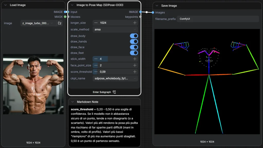 Questo workflow non “crea immagini belle” ma produce un intermedio tecnico (la pose map) che poi userai altrove come controllo. Se lo guardi con questa lente, ogni nodo inizia ad avere senso.