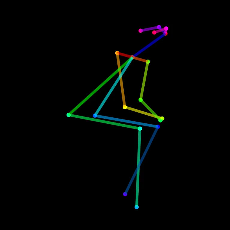 I keypoints sono un dato “strutturato” (solitamente JSON), non un’immagine. In pratica sono un insieme di coordinate (quasi sempre x, y in pixel, a volte anche una confidence per ogni punto) che descrivono dove il modello ha trovato parti del corpo, spalle, gomiti, polsi, anche, ginocchia, caviglie e, con i modelli “wholebody”, anche punti di mani, volto e piedi. Spesso includono anche l’informazione su quali punti sono collegati (lo scheletro), oppure quella connessione è implicita perché lo schema dei punti è fisso. Qui sotto possiamo vedere l’immagine di posa e il rispettivo codice JSON che la rappresenta.