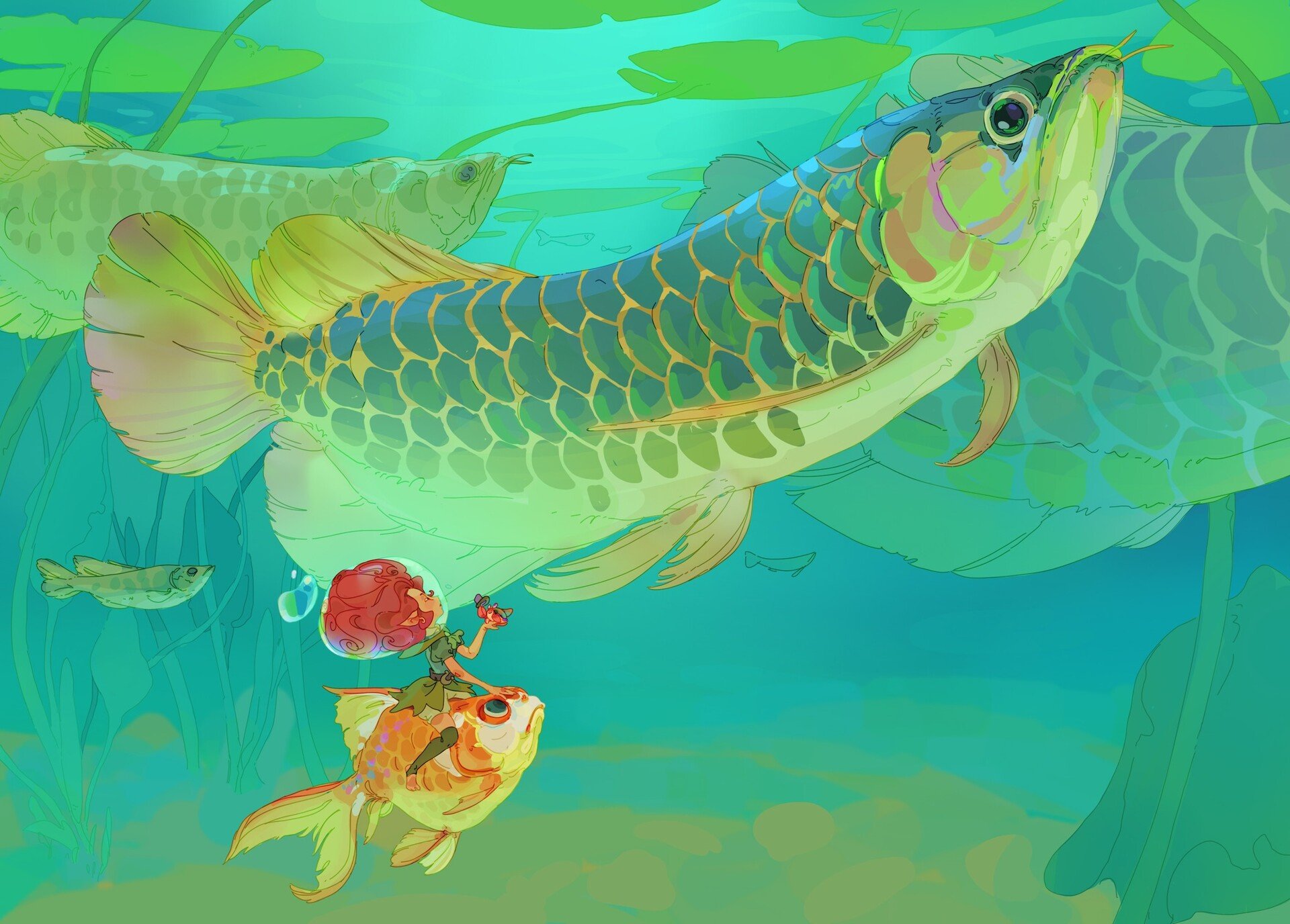 La giovane esploratrice, con i suoi capelli rossi raccolti sotto una piccola cupola d’aria, è una figura che incarna curiosità e spirito d’avventura. Il pesce dorato che cavalca appare come un compagno fedele, piccolo ma determinato. L’Arowana, con le sue imponenti squame dettagliate, è simbolo di maestosità e antico potere sottomarino. Questi personaggi, seppur contrastanti nelle dimensioni, interagiscono in un modo che sottolinea l’armonia e la convivenza tra esseri di diversa natura.