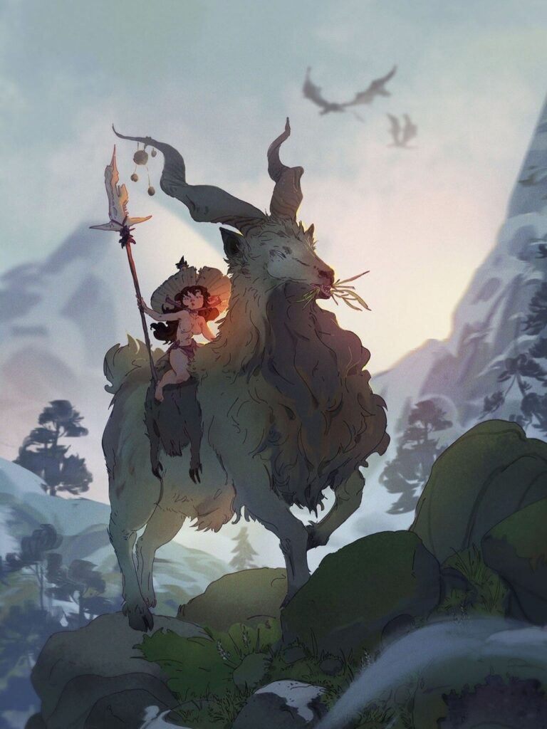 L’immagine raffigura una scena epica ambientata in un paesaggio montano, dove una giovane guerriera, abbigliata in modo primitivo, cavalca una grande capra dalle corna maestose. Sullo sfondo, le montagne si stagliano contro un cielo pallido e sfumato, mentre delle creature volanti appaiono appena visibili in lontananza, aggiungendo un tocco di mistero e grandezza.