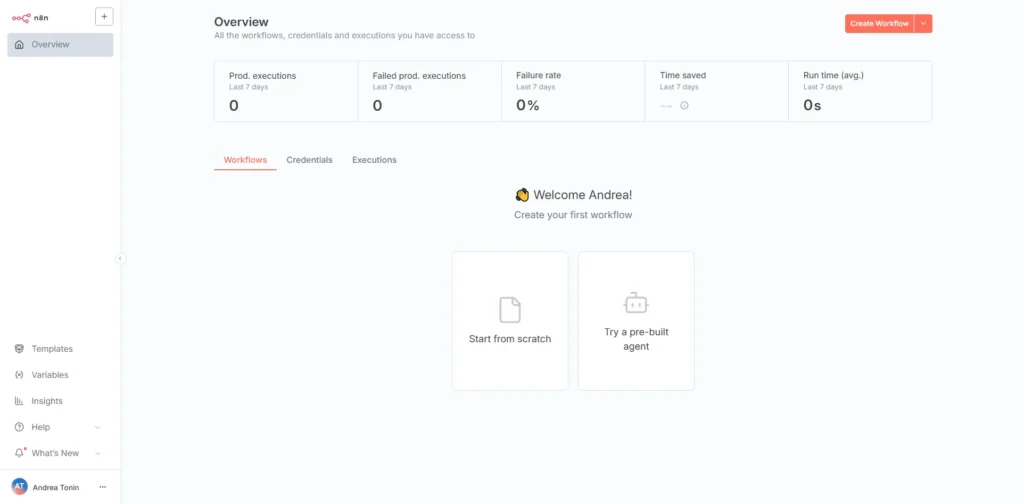 Se tutto è andato per il verso giusto dovresti vedere la dashboard di n8n come in figura.