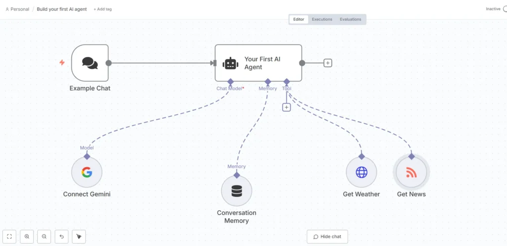 - Il messaggio viene elaborato da “Your First AI Agent”.