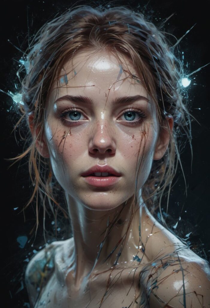 L’immagine è un ritratto intenso e realistico che cattura l’essenza della forza interiore e della resilienza umana. La pelle bagnata della donna e i suoi capelli disordinati sono resi con una straordinaria attenzione ai dettagli, creando un effetto iperrealistico. Gli spruzzi di acqua e detriti che la circondano aggiungono una dimensione dinamica alla composizione, suggerendo il movimento e la violenza della tempesta da cui è appena uscita. Il contrasto tra la delicatezza dei suoi lineamenti e la brutalità dell’ambiente crea una tensione visiva che attira lo spettatore. La scelta cromatica di toni freddi e metallici sottolinea ulteriormente il tema della lotta e della sopravvivenza in un mondo post-apocalittico, mentre la luce che si riflette nei suoi occhi suggerisce un barlume di speranza e determinazione.